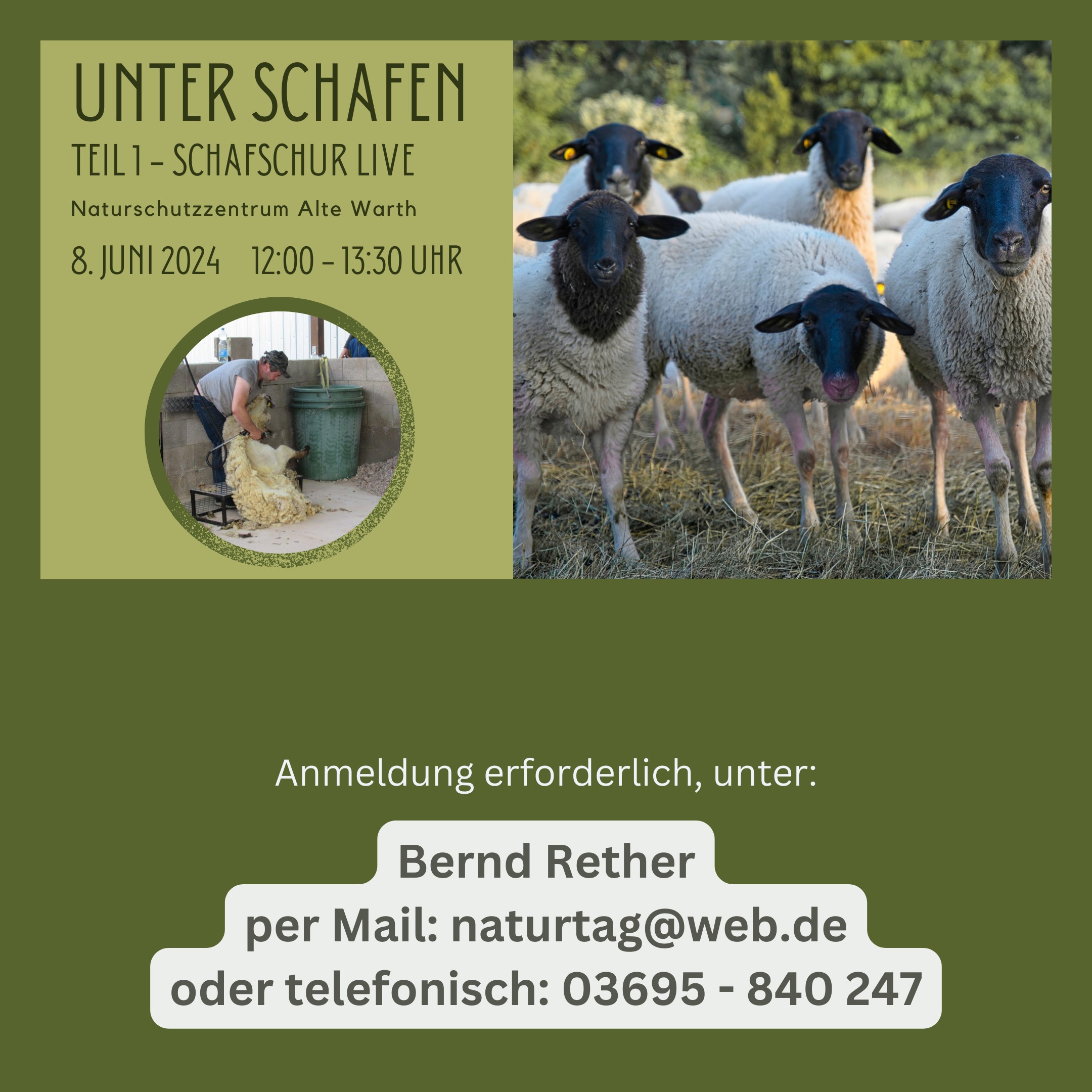 Es geht ums Schaf! Ihr wolltet schon immer mal dabei sein, wenn einem Schaf die Wolle geschoren wird und eine Schur live miterleben? Dann kommt in das „Naturschutzzentrum Alte Warth“ (36433 Gumpelstadt). Von 12:00 bis 13:30 Uhr könnt ihr live bei der Schafschur dabei sein und anschließend den vierbeinigen Landschaftspflegern bei der Arbeit zusehen.